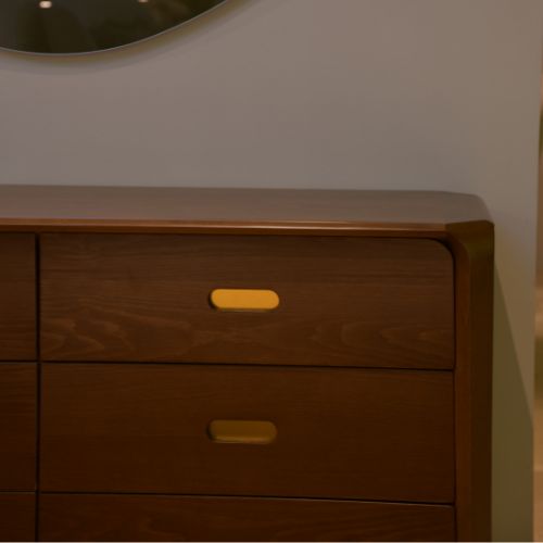 En face du lit se trouve une grande commode à six tiroirs. Les six sont équipés par des poignés. Cette commode offre un espace de rangement généreux pour vos vêtements et autres objets personnels. Sur le dessus de la commode, un miroir ajoute une dimension de style à la chambre tout en offrant un espace pour se préparer le matin ou se rafraîchir avant de se coucher.